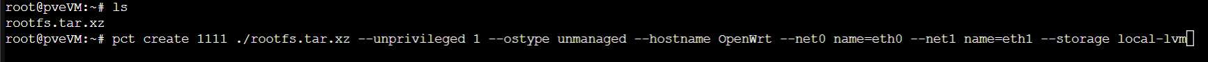 pct create 1111 ./rootfs.tar.xz --unprivileged 1 --ostype unmanaged --hostname OpenWrt --net0 name=eth0 --net1 name=eth1 --storage local-lvm