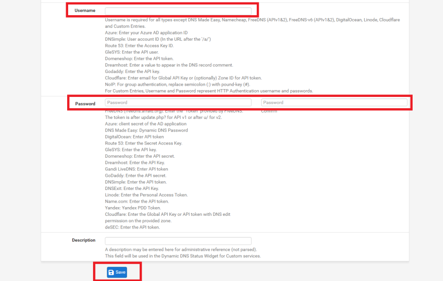 En el apartado de Username y Password, añade tu usuario y contraseña usado para No-IP ya que de esta forma pfSense pueda acceder a la plataforma de No-IP sin tener que usar ningún token extra. Una vez hayas introducido los campos de Username y Password, haz click en el botón de Save y ya estará todo configurado para poder usar las VPNs.